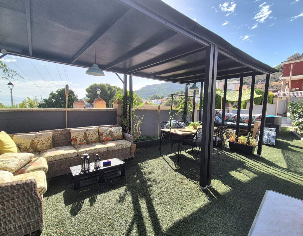 La propiedad se encuentra en la parte alta de la urbanización. Se accede a la propiedad, que está completamente vallada, ya sea por un portal o por una puerta corredera eléctrica. Dispone de amplio aparcamiento para al menos 5 coches. Dispone de varias zonas de estar y diferentes espacios en el terreno para usar como desee, todo prácticamente llano. A la izquierda de la propiedad se encuentra una agradable zona de estar con pérgolas y una cocina exterior con bonitas vistas al valle y una pequeña piscina / jacuzzi. Hay dos entradas a la propiedad: la puerta principal y una entrada trasera desde la zona de aparcamiento hasta el pasillo/cocina.