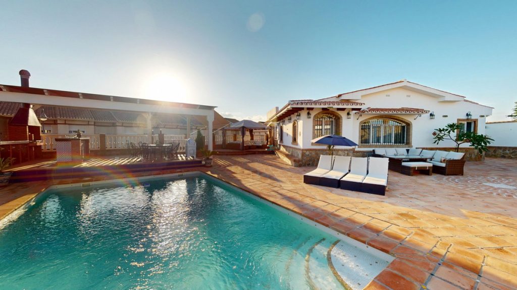 Villa independiente, Caleta de Vélez presume de ser el puerto pesquero más importante de la provincia de Málaga. Puede pasear por el muelle y ver cómo los pescadores preparan sus redes para faenar y, al amanecer, deleitarse viendo los barcos pesqueros entrar para arribar con sus capturas. A lo largo del paseo marítimo hay restaurantes y bares donde se puede degustar platos típicos y pescados frescos de la zona. Cuenta, también, con puerto deportivo para barcos recreativos. Si desea tener uno, estaría casi en la puerta de su casa. Desde el puerto se puede andar hasta Torre del Mar por uno de los mejores paseos marítimos de España. En el pueblo hay todo tipo de comercios, y los sábados por la mañana se monta el mercadillo, donde puede encontrar cerámicas típicas, ropa, fruta y alimentos artesanales de la comarca. A menos de diez minutos andando al puerto se encuentra esta fantástica propiedad. Cuenta con una enorme parcela en la que la vivienda tiene la particularidad de estar en una de las esquinas, por lo que el espacio exterior está muy bien aprovechado. Una gran piscina, donde el sol da a lo largo todo el día, junto a una preciosa pérgola de madera con una mesa para ocho o diez personas y una barbacoa de obra, crearán inolvidables momentos con familia y amigos. Pasando al interior de la casa, a mano derecha del recibidor, se encuentra un dormitorio que se utiliza como despacho. A mano izquierda se entra a un amplio salón con chimenea y a uno de los dormitorios; el otro está frente a la puerta principal. Los dos dormitorios son espaciosos y cada uno cuenta su cuarto de baño y amplio vestidor. Desde el salón se accede a una cocina, muy luminosa y moderna, que cuenta con electrodomésticos de la más alta calidad. Desde la cocina se puede salir a la parte trasera de la vivienda donde está el lavadero y un cuarto de baño para uso exterior. La planta baja se compone de dos habitaciones. Una es una sala de juegos y televisión, y la otra es un cuarto de música. En esta planta también hay un cuarto de baño. Tiene salida independiente a la calle, a un aparcamiento exterior privado, aparte de las dos cocheras. Las calidades de esta vivienda son excepcionales. Los suelos, las puertas, el mármol, las baldosas… todo es lo mejor que el mercado ofrece. Existe la posibilidad de construir una tercera planta. Si desea más información, no dude en ponerse en contacto con nosotros.