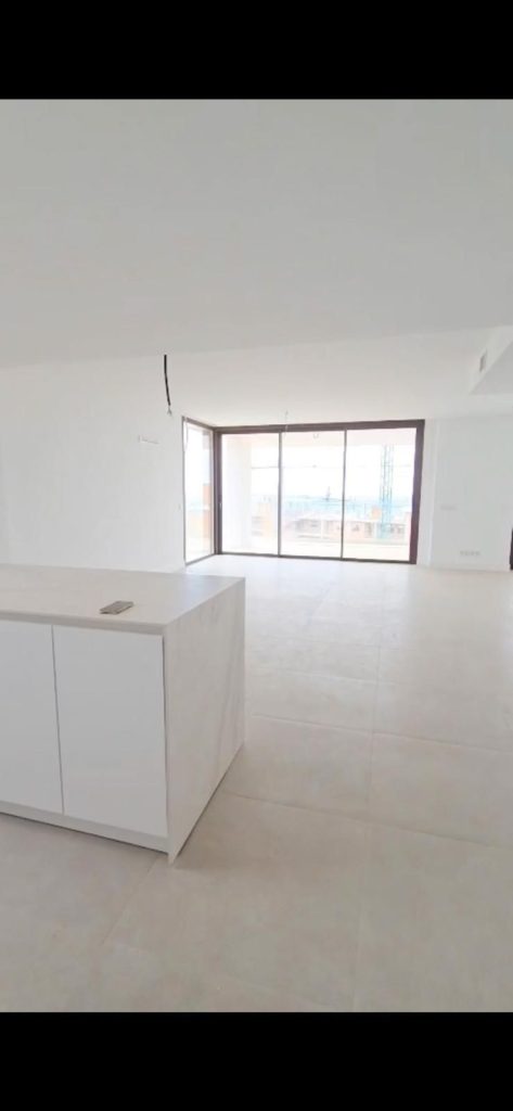 Originalmente diseñado como un apartamento de tres dormitorios, la distribución ha sido cuidadosamente transformada en una espaciosa vivienda de dos dormitorios. Esta modificación ha permitido crear una zona de estar significativamente más amplia, mejorando tanto la sensación de amplitud como el confort diario. La cocina de concepto abierto—equipada con electrodomésticos Bosch de alta gama y acabados de calidad—se integra perfectamente con el salón, que a su vez conecta directamente con la terraza a través de grandes ventanales.